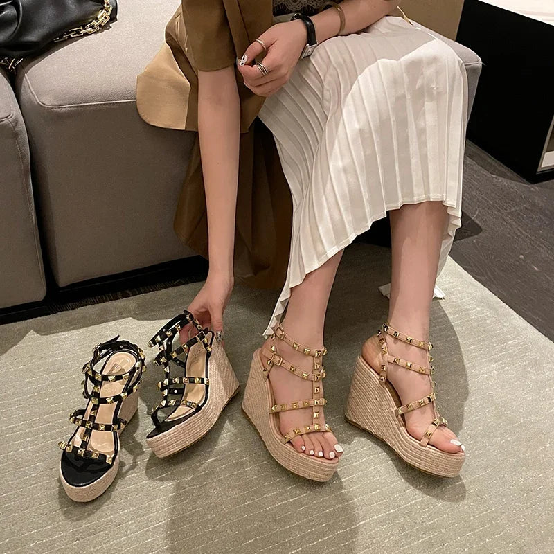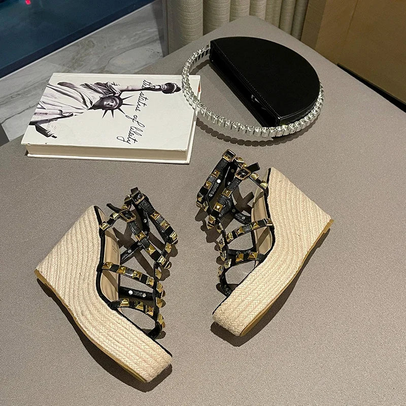 Rivet Wedges Women Sandals Open Toe Ankle Buckle Strap Ladies Platform Wedges Sandals High Heels Roman Rattan Grass Woven Shoes